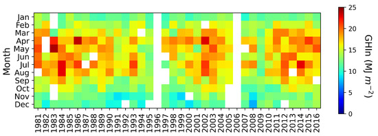 Monthly mean global solar insolation (GHIn, in MJ m per day) for each year during the measured period, from 1981–2016.
