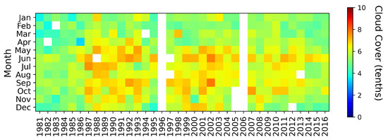 Figure 7 shows the monthly means of cloud cover for the entire series in order to study the role of clouds on the results shown in Figure 6 for the monthly means of solar insolation. It can be seen that in general cloud cover varies between 5 and 7 tenths. June and February usually show for each year the highest and the lowest cloud cover values with a mean value of 7 and 5 tenths, respectively. The 1981–1984 period presents lower cloud cover values in general than the other years with monthly mean values between 3 and 5 tenths. In fact, the low cloud cover in this period is in agreement with the high insolation values shown in Figure 6 for this period; as an example, April 1986 showed the highest insolation which is related with the lowest cloud cover in Figure 7 which is observed for the same month and year. The 2014–2016 period also shows a lot of months with cloud cover below 6 tenths, which could be responsible in part of the relative high insolation values observed in the same period. The cloud cover values for the year 2009 are not very different from the values in other years (e.g., year 2001 presents more cloud cover), therefore, cloud cover may not be the only reason for the low values of the insolation found for this year. The occurrence of the maximum in April in the general climatology as given in Figure 4 reveals the mentioned impact of clouds on solar radiation because April showed lower cloud cover than other summer months.