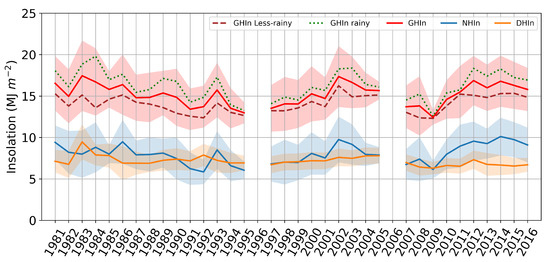 Annual averages of global (GHIn), diffuse (DHIn) and direct (NHIn) horizontal solar insolation for the 1981–2016 period. Shaded areas correspond to standard deviation. GHIn is also represented for rainy period (dotted green line) and less rainy period (dashed brown line).