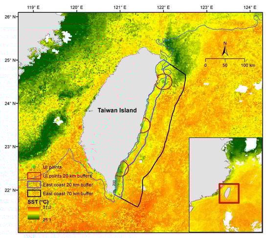 The study area is the coastal area of eastern Taiwan Island; the thick blue and black lines indicate the 20 km and 70 km buffers from the east coast of Taiwan; the green dots indicate the locations where the upwelling index (UI) was calculated using the CFS wind data; the red lines indicate the 20 km buffer around the UI points; the thin blue line is the 200 m isobath representing the approximate boundary of the continental shelf. The background image is the H-8 SST image on 19 July 2016.