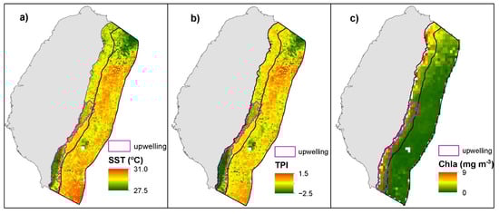 As examples, the H-8 SST image on 19 July 2016, the TPI image calculated from the SST image, and the corresponding chlorophyll-a image are displayed in Figure 1 and Figure 2. Two upwelling areas were identified along the central and southern sections of the Taiwan east coast, with lower SST values, negative TPI values, and higher chlorophyll-a concentrations than the offshore area.