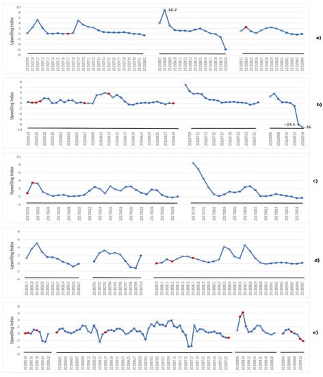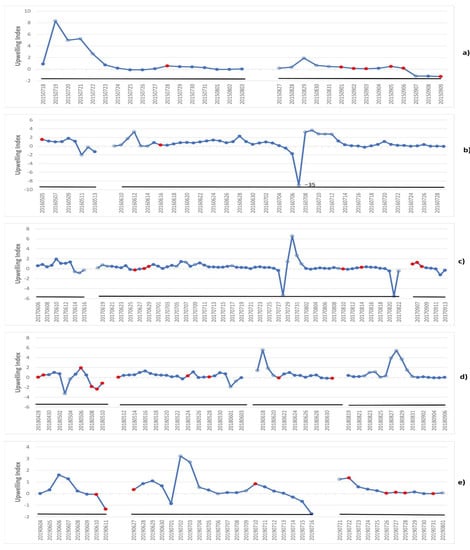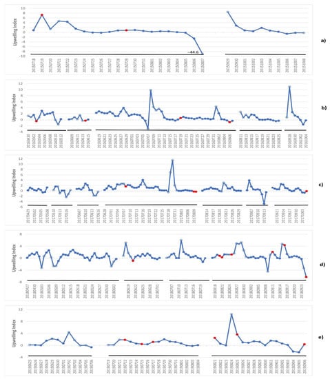 Time-series of the significant upwelling-favorable wind events at the northern location; (a) 2015, (b) 2016, (c) 2017, (d) 2018, (e) 2019. The solid blue (red) circle indicates that the upwelling (non-upwelling) was detected at the location; while, the un-filled circle indicates that the upwelling status was uncertain because more than 50% of the 20 km buffer has no data in H-8 SST. The labelled value(s) are actual UI value(s) that could not be properly plotted.