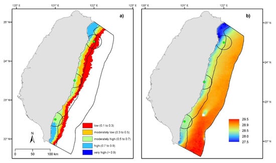 The climate of Taiwan Island is predominantly affected by the East Asian monsoon. Hence, the weak southwesterly/southerly (strong northeasterly/northerly) winds usually prevail in summer (winter) []. The waters surrounding Taiwan Island are influenced by three major ocean currents []. Taiwan’s east coast is mainly affected by the northward-flowing Kuroshio Current; while the Taiwan Strait is also affected by the intrusion of the Kuroshio Current, in addition to the southward flowing China Coastal Current in winter and the northward-flowing extension of the South China Sea Warm Current (or the Taiwan Strait Warm Current) throughout the year. In general, the SST is lower in the Taiwan Strait than that in the east of Taiwan, with an annual mean of >26 °C []. The salinity ranges 31–34 psu and has a relatively large spatial-temporal variability in the Taiwan Strait; while, it remains relatively stable east of Taiwan [].