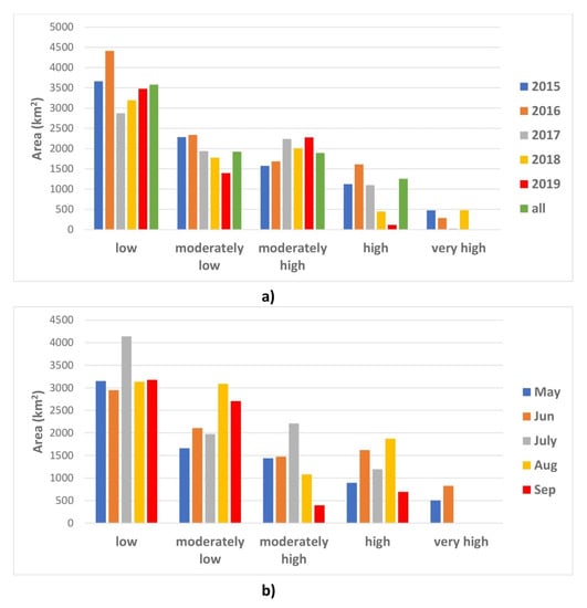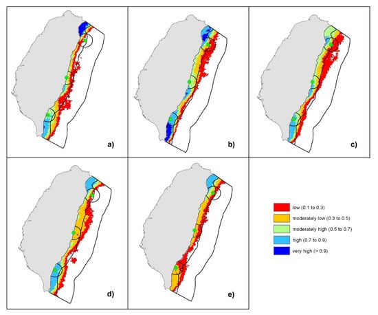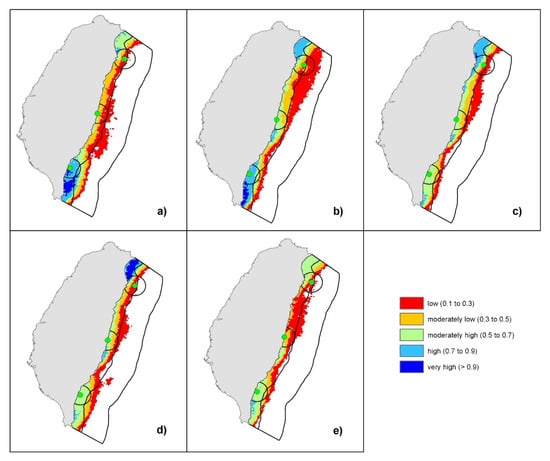 The inter-annual upwelling frequency maps were generated by combining the daily upwelling maps of the corresponding years; (a) 2015, (b) 2016, (c) 2017, (d) 2018, (e) 2019. The frequency is divided into five categories: low, moderately low, moderately high, high, and very high.