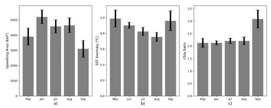 The monthly variation of upwelling’s characteristics; (a) the upwelling area, (b) the upwelling’s SST anomaly, (c) the upwelling’s chlorophyll-a ratio. The error bars indicate 95% confidence intervals.