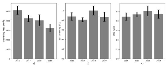 The interannual variations of the upwelling characteristics; (a) upwelling area, (b) SST anomaly, (c) Chla ratio. The year 2015 is not included as it is an incomplete year of data. The error bars indicate 95% confidence intervals.