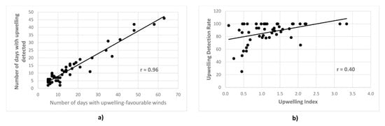 (a) Correlation between the number of days with upwelling-favorable winds and the number of days with upwelling detected from the H-8 SST data (n = 50); (b) correlation between the wind-driven upwelling index and the upwelling detection rate from the H-8 SST data. Each point represents one significant upwelling-favorable wind event (n = 50).