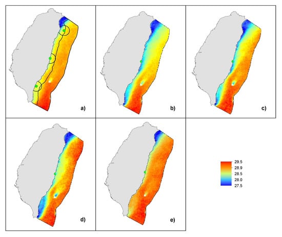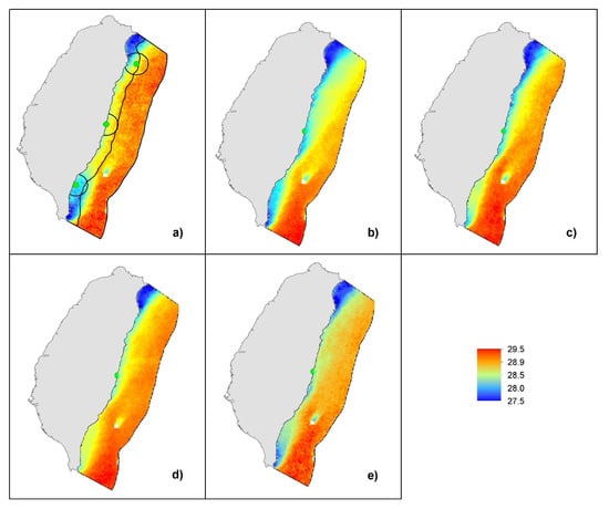 The monthly-averaged SST maps were generated by combining the daily SST maps of the corresponding months; (a) May, (b) June, (c) July, (d) August, (e) September.