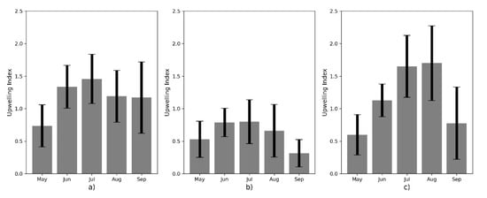 Monthly mean wind-driven upwelling index; (a) north, (b) central, (c) south. The error bars indicate 95% confidence intervals.