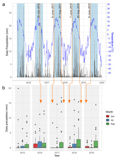 Meteorological conditions experienced during this study with (a) daily precipitation values represented in the bar plot and the 7-day running mean temperature represented as the blue line. Daily precipitation is also shown (b) grouped by month. Boxes represent the interquartile range (IQR) below the 75% quantile for each month. Median daily cumulative precipitation for each month is shown as a line inside each box. Whiskers extend to the greatest value equal to 1.5 × IQR above the 75% quantile. Points above whiskers are statistical outliers. Orange arrows highlight the timing of six RPAS surveys conducted during this study.