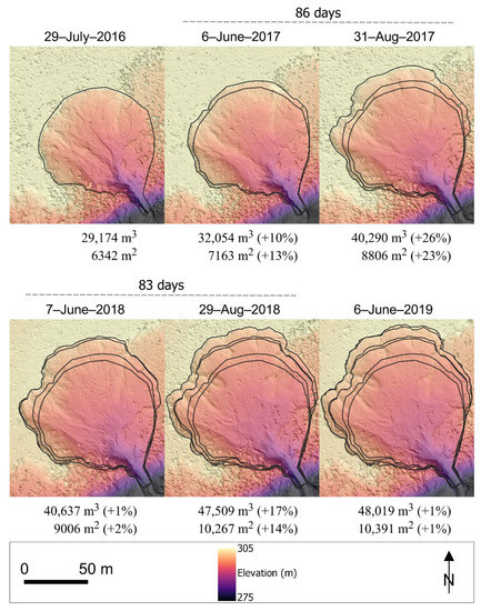 The 2016–2019 time series of high-resolution DSMs produced from SfM provide insight of the seasonal and interannual timing of evacuations. This approach has been performed for many sites across Northwest Territories, Canada, where thaw slumps have reached fill volumes of 3.2 × 103 to 5.9 × 106 m3 [17]. Slump1 reached a fill volume of 4.8 × 104 m3 by spring 2019, which was 61% greater than its size following the first RPAS survey in July 2016. The (~1-ha) area of Slump1 is relatively large for OCF based on comparison with other thaw slump scars observed in oblique aerial photographs from reconnaissance flights and general assessment of airborne datasets (i.e., AVIRIS-NG). Thaw slump area is much more variable in other landscapes. For example, the median area of thaw slumps across Tuktoyaktuk, NT is 0.4 ha, but reach as large as 5 ha [13].