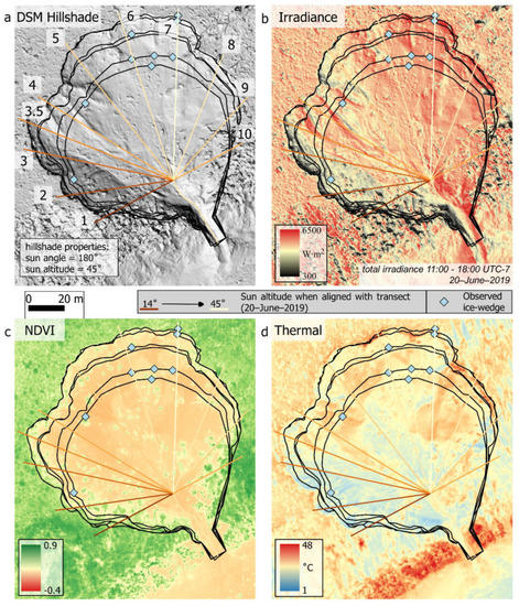 Mapping products generated from RPAS surveys conducted during this study including the (a) DSM, (b) total irradiance during summer solstice (11:30–17:30 UTC-7), (c) NDVI, and (d) thermal (°C). The colour of the superimposed transects correspond with sun altitude when the transects are aligned with the sun azimuth at the corresponding time of day. Dark brown represents low sun altitude earlier in the day, while yellow represents high sun altitude during the late afternoon. Blue points represent the locations where and when ice wedges were observed within the headwall exposure.