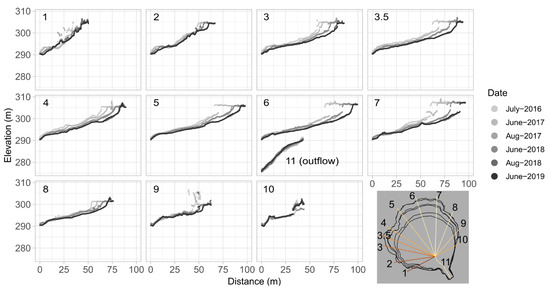 Differences in headwall retreat length during the period 2016–2019 (after the initial evacuation had occurred) were compared among 10 transects extending from the central outflow of Slump1 to 5 m outside of the 2019 headwall boundary (Figure 5; Table 2). A transect following the outflow path from the central area (transect 11) is also included in the plot with transect 6. For all ten transects combined, the mean headwall retreat from 29-July-2016 to 6-June-2019 was 17.1 m. The minimum retreat occurred closer to the outflow mouth along SW-NE transects (1, 2, and 10). Greater headwall retreat occurred towards the northwest represented by transects 3, 3.5, and 4, which experienced 17.6, 24.0, and 16.9 m cumulative headwall erosion, respectively. Transects 8–10 are directed to the northeast into an adjacent RTS scar. The greatest retreat during the three-year period was experienced along the northern headwall among transects 5, 6, and 7, which showed 24.9, 27.3 and 29.0 m cumulative headwall erosion length, respectively. Notably, the greatest amount of headwall retreat occurred along transect 7, which aligns with the sun azimuth (181.5°) at the time of maximum sun altitude (45.5° at 14:26 UTC-7; Table 2) during summer solstice (20-June-2019).