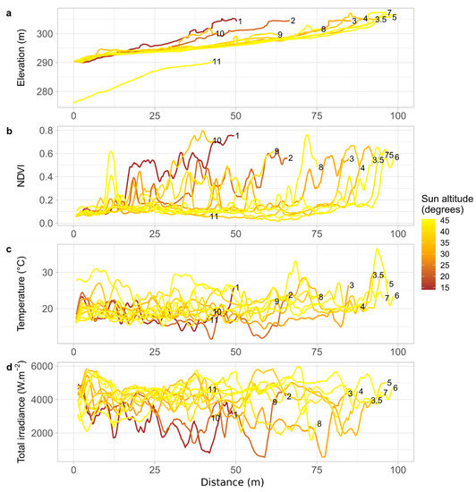 Comparison of (June 2019) profiles of RPAS-derived (a) elevation, (b) NDVI, (c) ground temperature, and (d) total irradiance during peak sun hours (11:30–17:30 UTC-7). Line colours are grouped by sun altitude, with darker colours being relatively earlier or later in the day versus lighter yellow representing profiles aligned with the sun at peak midday hours.