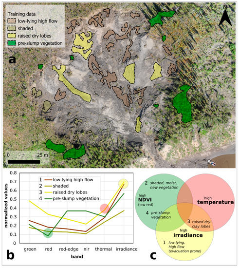 In summary, the combination of irradiance, multispectral (calibrated green, red, red-edge, and NIR reflectance bands) and thermal data distinguished key geomorphological characteristics within Slump1 (Figure 7), which were observed in the field and were discernable within the high (0.84 cm) resolution orthomosaic. Four classes of interest identified in the field and in the high-resolution RPAS data can be described as (1) low-lying, mixed clay-silt, and barren sediment with high irradiance, low temperature, and prone to mass wasting; (2) headwall-shaded areas with varied relief, cool temperatures and establishment of graminoid and moss vegetation; (3) raised, barren, dry clay lobes, with high irradiance, and temperature; and (4) pre-thaw slump vegetation (e.g., spruce, shrub, grass and moss mat). Figure 7 shows example locations of these terrain classifications identified within Slump1 during the 2019 survey (Figure 7a). The associated normalized spectral signatures of the multispectral, thermal, and irradiance bands within the polygons (Figure 7b) have super-imposed circles identifying the key differences that allow for effective differentiation of the terrain types. The visible and NIR bands were useful for distinguishing all four classes, but mostly for identifying pre-slump vegetation and shaded areas with new vegetation growth (Figure 7b,c). High irradiance values distinguished the open and barren terrain types (classes 1 and 3) from the shaded areas (class 2; yellow circle in Figure 7b,c). Whereas thermal data effectively distinguished the warmer, raised dry clay lobes (class 3) from the cooler, low-lying high flow class 1.