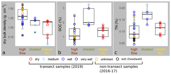 Comparison of thaw slump sediment (a) dry bulk density (g cm−3), (b) SOC (%), and (c) TN (%). Points are separated along the x axes based on thaw slump terrain classes. Point colours represent the qualitative description of sediment moisture. Values derived for the period 2016–2017 were grouped within the low-lying, high-flow class. Bulk density uncertainty was +/− 10.5% based on triplicate analysis of each sample. Boxes represent the interquartile range (IQR) between the 25% and 75% quantiles for each terrain class. Median values for each terrain class are shown as a line inside each box. Whiskers extend to the greatest value equal to 1.5 * IQR below the 25% quantile and above the 75% quantile. Points above and below whiskers are statistical outliers.