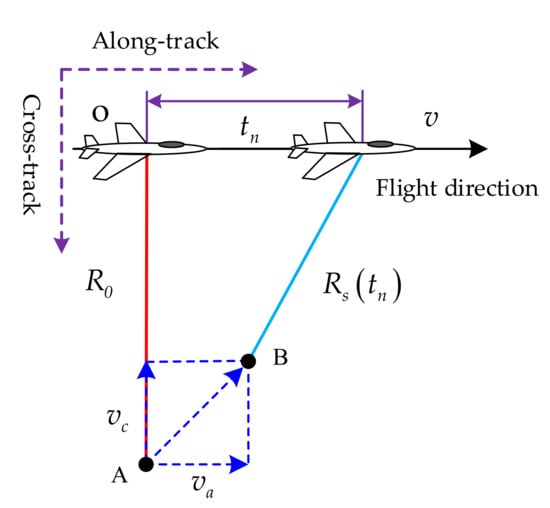 The side-looking strip-map mode SAR is considered. Figure 1 displays the motion geometry between the SAR platform with constant velocity and ground moving target on the 2D slant rang plane. During the integration time , the moving target travels from point A to B, where and indicate the cross-track velocity and along-track velocity, respectively. As illustrated in Figure 1, the nearest and instantaneous slant range between the radar platform and moving target are denoted by and , respectively. The azimuth-time (slow-time) variable is represented by .