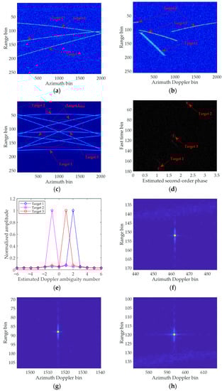 Figure 5 shows the simulation experimental results. The range compression results of three targets are depicted in Figure 5a. Three curved trajectories of Target 1, Target 2 and Target 3 are found in Figure 5a, and these trajectories of targets occupy multiple range bins due to the effect of RM, resulting in severe target energy defocusing. The azimuth Doppler spectrum distributions of Target 1, Target 2 and Target 3 are illustrated in Figure 5b. Notably, the energy of three targets still spans over the azimuth Doppler frequency domain given the effect of DFM, which leads to serious defocusing. Additionally, the target azimuth spectra of Target 1 and Target 3 distribute into one PRF band, and the target azimuth spectrum of Target 2 occupies two PRF bands. Figure 5c displays the result after applying the parameter separation operation in Equation (10). Then, in order to illustrate the trajectories of three moving targets clearly, the background is removed. As shown in Figure 5c, the RWMs and DCSs of Target 1, Target 2 and Target 3 are accurately eliminated. Only the RCMs and DFMs of Target 1, Target 2 and Target 3 remain. With regard to cross-terms, RWM, RCM and DFM still exist. Figure 5d shows the result after performing MSOKT. Only three obvious peaks with respect to Target 1, Target 2 and Target 3 are exhibited in Figure 5d, and the cross-terms are still defocused, thereby helping to avoid the effects of cross-terms. In accordance with the peak positions in Figure 5d and KT, the estimated results of Doppler ambiguity numbers for Target 1, Target 2 and Target 3 are shown in Figure 5e. After the residual RWMs of Target 1, Target 2 and Target 3 are removed by the corresponding estimated Doppler ambiguity numbers, the well-refocused results of Target 1, Target 2 and Target 3 are presented in Figure 5f,g,h, respectively.