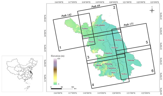 S-1 frame coverage over the whole Jiangsu province. The background is the Shuttle Radar Topography Mission (SRTM) digital elevation model (DEM) with elevation tuned by color. The location of Jiangsu province in China is shown in grey in the thumbnail image in the left.