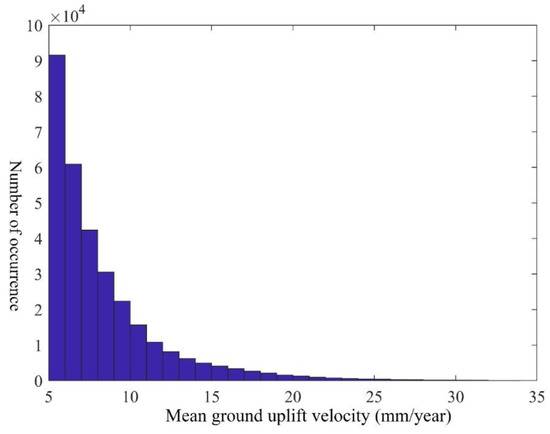 Histogram of coherent pixels (CPs) showing ground uplift with MSV in the range of [5, 32] mm/year.