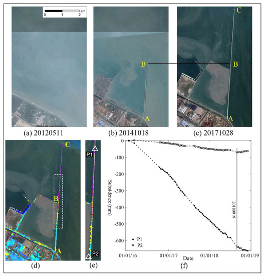 Subsidence in zone A of Figure 4. Optical images in May 2012, October 2014 and October 2017 are shown in (a), (b,c) respectively. Mean subsidence velocity of coherent pixels (CPs) are overlaid on the latest optical image in (d). The enlarged view of the dash-line rectangle area in (d) is shown in (e). The subsidence time series of two selected CPs: P1 and P2 in (e) are presented in (f).