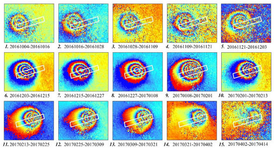 The frequent land-cover changes on farmland patches makes it nearly impossible to extract CPs there, and CPs only exist on some man-made targets, like power poles and buildings. Therefore, subsidence information is missed over a large part of ground above WPs in the MSV map as illustrated in Figure 8a. Fortunately, we found that S-1 interferograms with 12-day and/or 24-day separation can keep good coherence when both images are acquired in the period between October and the next March when the ground is bare or the sowed wheat is in its early growing stage. 15 consecutive 12-day interferograms over the region of WP 92,606 in the period of 4 October 2016 to 14 April 2017 are shown in Figure 9. It can be observed from the moving deformation fringes that the underground tunneling had advanced from west to east along the strike direction of the coal seam. These 12-day and 24-day interferograms with good coherence can be reliably phase-unwrapped. Then the LOS deformation related to individual SAR acquisition can be calculated under the least squares principle by linking all of the unwrapped phases. Using this method, the accumulative deformations of the four WPs in the two coherent periods: from 16 October 2016 to 21 March 2017 and from 23 October 2017 to 4 March 2018, are calculated and shown in Figure 8c,d respectively. From Figure 8c, the largest accumulative deformation of WP 92,606 within the first coherent period (from 16 October 2016 to 21 March 2017) reaches 670 mm with underground extraction in progress. At the same time, there is no deformation over the areas of WP 74,102 and 93,604 because the coal extraction had not yet started during the first coherent period. It can be inferred that the ground deformation highly coincide temporally with mining operations, and can reach hundreds to thousands of millimeters in several months. Ground deformation could be observed even after mining activities end, as suggested by a small-scale deformation field appeared on the upper-left side of WP 74,101 in Figure 8d. Therefore, ground deformations associated with underground mining are strongly nonlinear during the whole study period of January 2016 to December 2018, and may not be correctly retrieved by the linear phase model. As a further illustration, deformation time series of 6 points (P1, P1*, P2, P3, P4, P5) are given in Figure 10, whose locations are marked by triangles in Figure 8a,c,d respectively. From Figure 10a, although P1 and P1* refer to the same location, the deformation calculated with the least square method over the first coherent period (P1* curve) is obviously larger than that from time series processing (P1 curve). This confirms that deformation caused by underground mining could be underestimated by time series InSAR analysis for the whole study period. On the other side, the curves at P2, P3, P4 and P5 in Figure 10b demonstrate that the magnitude of deformation triggered by active underground mining is usually very large. In summary, the deformation information in this underground mining region is missed spatially due to the lack of CPs, and underestimated in magnitude due to the temporal uneven of mining operations.