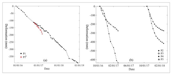 Deformation time series of six points whose locations are marked as triangles in Figure 8a,c,d: (a) point P1 and P1*; (b) point P2, P3, P4 and P5. Please note, P1 and P1* refer to the same location.