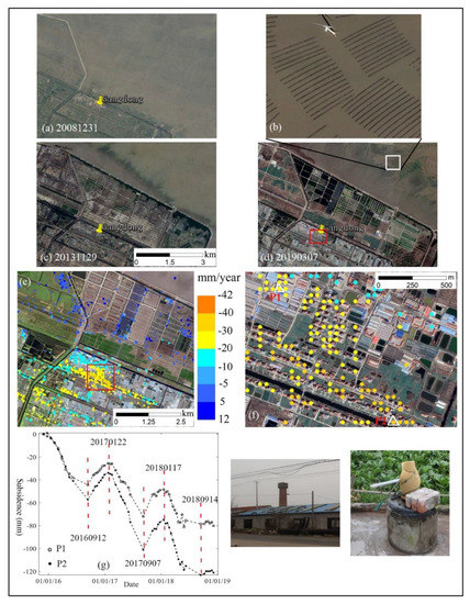 Three historical optical images of subsidence zone D are shown in (a,c,d). An enlarged view of the white-line AOI in (d) showing laver culture rafts in the sea is given in (b). An enlarged view of the red-line AOI in (d) with CPs’ MSV overlaid is given in (e) and a further enlarged view shown in (f). The subsidence time series of two CPs marked by white-line triangle in (f) is shown in (g). In the right of (g), two on-site photos taken during the field campaign are shown, which highlight a water tower and a family-use well respectively.