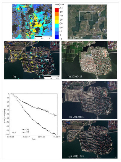 Subsidence zone E is located in Wujiang county within the Suzhou prefecture and close to the south bank of Taihu Lake, where canals, lakes and ponds were densely distributed, and historically known as “a land of fish and rice.” The enlarged view of MSV is shown in Figure 13a. The MSV within the white-rectangle AOI is furthered enlarged and shown in Figure 13b with a high-resolution optical image as the background. Four historical optical images corresponding to the AOI are given in Figure 13d–g. It can be seen that previous farmland, paddy and ponds as shown in Figure 13d,e were transformed to residential building region in 2017 as shown in Figure 13g. The subsidence time series of two CPs are given in Figure 13c, both of which present steady subsiding tendency with rate slightly slowing down as time passes. At the same time, the time of land use transition happed at P2 (from farmland to building) is at least 3 years earlier than that at P1(from pond to building), that is, consolidation of underlying soft soil layer at P2 started at least 3 years earlier than that at P1. Therefore, the MSV at P1 (−41 mm/year) is much larger than that at P2 (−15 mm/year). This temporal feature of the subsidence is similar with that in zone A, and also matches the Terzaghi theory of consolidation [29]. Furthermore, there is no excessive groundwater withdrawal or any other activities which may result in ground subsidence in this region. So, we can infer that ground subsidence in zone E is caused by the consolidation of underlying soft soil layers.