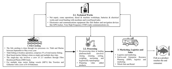 India has a vast coastline and its maritime states/Union Territory (UT) are the major contributor to the country’s blue economy [12,13,14]. The blue economy is the sustainable use of ocean resources for economic growth, improved livelihoods, and jobs while preserving the health of the ocean ecosystem [15]. The fisheries sector contributes around 1.03% of India’s GDP (2017–2018), with the export worth $7.1 billion [16]. The country produces more than 12 million tonnes of inland and marine fisheries products annually, a third of which is through the marine route. According to the National Fisheries Development Board (NFDB) of India, the marine fisheries sector employs (directly and indirectly) more than 16 million fishing workers and their families in 3477 marine fishing villages across the seventy coastal districts of the country [13,17,18,19]. This highlights the importance of the Indian fishing industry and the coastal regions, both for livelihood and nutrition perspectives [20,21,22].