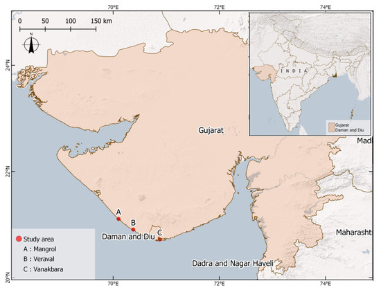 The study area is located in the western part of India in the state of Gujarat and UT of Daman and Diu, which has a quarter of India’s mainland coastline. Historically all forms of fishing, viz., marine, estuarine, riverine, and freshwater, are conducted in this region [23]. This study is focused on three harbor areas, i.e., Mangrol and Veraval in Junagadh and Gir Somnath districts of Gujarat, and Vanakbara in the UT of Daman and Diu (Figure 2). Figure 2 shows the locations of the study sites in the Gujarat state of India. The selection of study sites is based on their characteristics and availability of cloud-free satellite images.