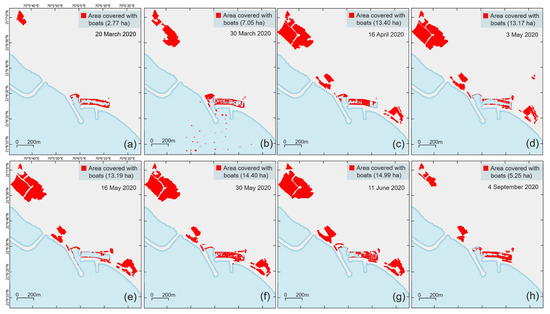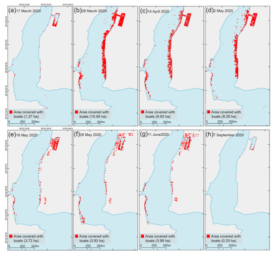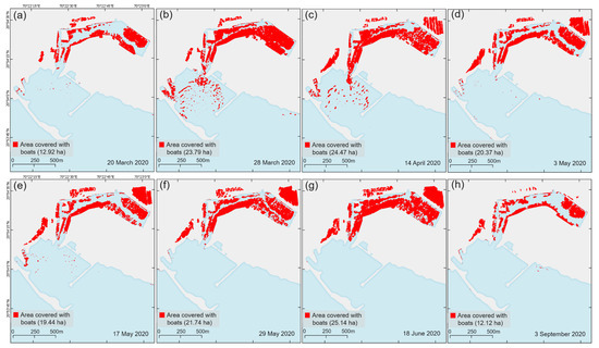 Figure 3. Classification results with the red areas indicate fishing boats in Mangrol harbor. Satellite data were acquired on (a) 20 March, (b) 30 March, (c) 16 April, (d) 3 May, (e) 16 May, (f) 30 May, (g) 11 June, and (h) 4 September 2020.
