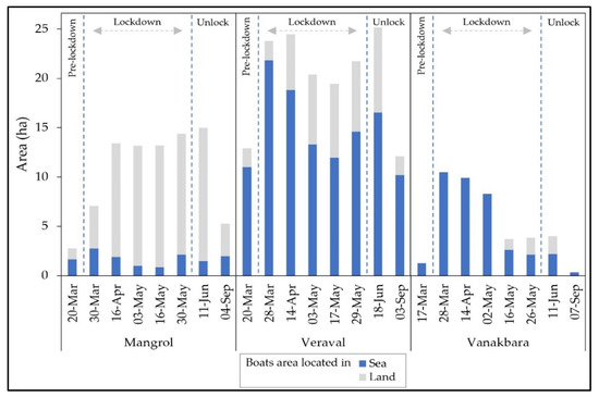 At Mangrol, during the pre-lockdown period (on 20 March 2020), the total area covered under the boats was 2.77 ha (Figure 3a and Figure 6). However, anticipating the uncertainty during the pandemic and successive extensions of the lockdown, the fisheries workers preferred safer and long-term parking near the land area. Consequently, the area under boats at Mangrol harbor rose sharply during the lockdown phases from 7.05 ha (30 March 2020) to 13.40 ha (16 April 2020), respectively. This slightly decreased to 13.19 ha only after the relaxation of lockdown (at the end of phase-III).
