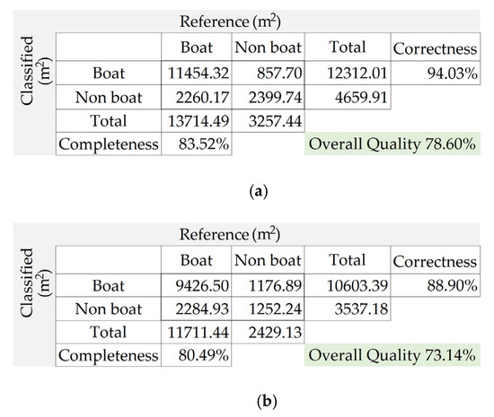 Our validation used the area-based accuracy assessment considering the correctness and completeness of classified objects [56]. Correctness is defined as the percentage of extracted objects that are correctly classified. In contrast, completeness is the percentage of objects in the real world (reference data). These are explained by the extracted objects, and overall quality refers to a percentage of matched objects among the total objects in both classification results and reference data [56]. This assessment is focused on the particular object; hence, it is suitably used in this study which aims to identify only the boat as an object. Adopting the methods by Whiteside et al. [57] and Kamal, et al. [58], circular buffers were used for each validation site with a radius of 30 m.
