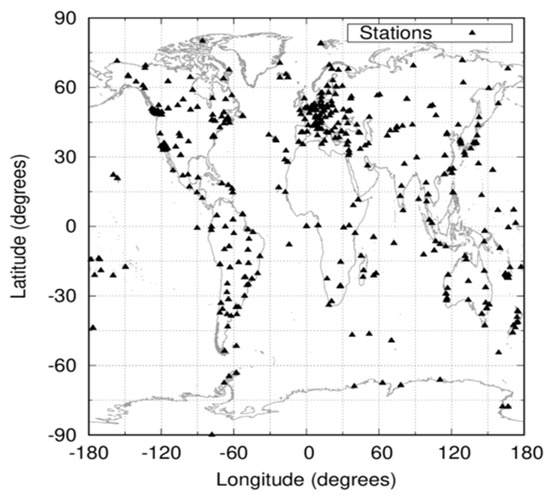 For every of those 12 days, we downloaded all observation files available in the Multi GNSS Experiment (MGEX) network [19] of the International GNSS Service (IGS) [20] in the Receiver INdependent EXchange (RINEX) format. We processed actual multi-constellation and multi-frequency data from 597 different permanent receivers, as depicted in Figure 1, worldwide distributed. The actual number of stations processed is higher, since some receivers produce different RINEX versions (V2 and V3) with different constellations (GPS+GLONASS only or full multi-constellation). The geographic diversity is important, as NeQuick-G uses the aforementioned MODIP latitude. Moreover, there is yet another reason to use evenly distributed stations: distributed stations more evenly can help us better determine the accuracy and consistency of NeQuick-G globally.