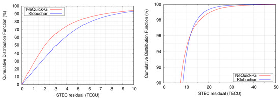 CDF of the STEC errors of NeQuick-G (red) and Klobuchar (blue) ICAs, compared to reference STECs obtained with IAR carrier-phase measurements. The left panel depicts the CDF of the STEC residuals up to 10 TECUs. The right panel depicts the CDF of the STEC errors when the CDF values ranges from 90 to 100%.