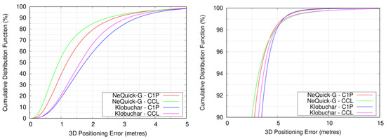 Figure 6 presents the CDF of the 3D positioning errors obtained when using the NeQuick-G and Klobuchar models. In a similar manner than in the previous analysis, we depict the CDF for rather small PVT errors in the top panel and a zoom of the CDF values greater than 90% in the bottom panel. As commented in the methodology section, for every ICA, we performed the estimation of the PVT with code-only pseudorange measurements and with CCL measurements. In this regard, it can be seen how the CDF curves of NeQuick-G ICA improve those of Klobuchar, up to 5.76 m (percentile 99.18th) for code-pseudorange measurements and up to 4.98 m (percentile 98.29th) for CCL measurements. This reflects the contribution of the code pseudorange measurements to the PVT errors. The effect of the tails of the PVT error distribution can be observed in the bottom panel; PVT errors obtained with CCL measurements are smaller than those of code-pseudorange measurements up to at 4.18 m (percentile 97.13th) in NeQuick-G and 5.23 m (percentile 98.60th) in Klobuchar. The worsening of CCL with respect to code pseudorange is attributable to a smaller number of satellites used to compute the PVT solution, after the necessary cycle-slip detection for the CCL process. As we can see, this only affects the large percentiles of Table 4, and, in turn, the RMS values.