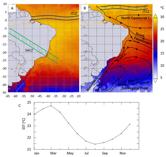 Monthly means MODIS-Aqua SST of March (A) and August (B) 2018, indicating the mean position of the ITCZ [22] and SACZ [23], and oceanic currents and fronts (adapted from [26]); and the average SST for the entire study region throughout 2018 (C).