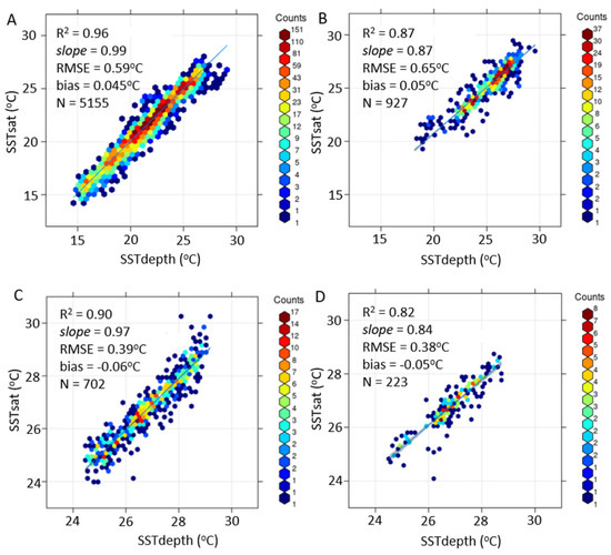 The comparisons of SSTsat with SSTdepth had an overall good agreement for the MDBs, with relatively low deviation (R2 between 0.82 to 0.96) and bias (<0.06 °C) (Figure 3). The best performance was with the daily average SSTdepth of the PIRATA moored buoys with lowest RMSE (<0.4 °C) (Figure 3C,D), and SSTdepth varying from 24–29 °C. The comparison with the hourly SSTdepth of the PNBoia drifting buoys had higher RMSE (0.59 °C) but also a high determination coefficient (R2, 0.96) and low bias (0.045 °C), and with SSTdepth representing a higher range: 14–29 °C. The comparison with the hourly SSTdepth of the PNBoia coastal moored buoys had the highest error statistics (RMSE, 0.65 °C), with an SSTdepth ranging from 18–30 °C.