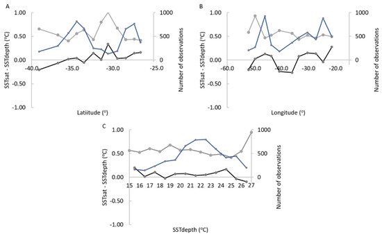 Difference between SSTsat and SSTdepth of the PNBoia drifting buoys vs. latitude (A), longitude (B) and SSTdepth (C). Mean bias is the black solid line, SD is the gray solid line and number of observations is the blue solid line.