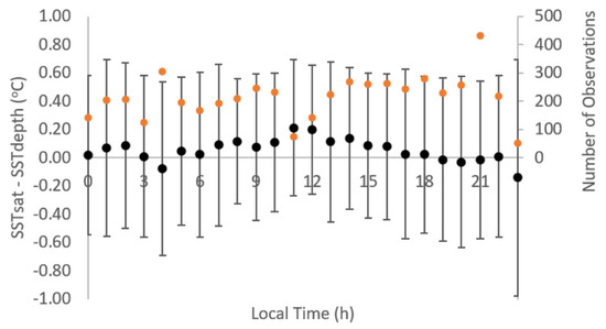 For the hourly differences between SSTsat and SSTdepth the highest positive values were obtained at the warmest daytime (11–12 h local time) with a mean difference of 0.20–0.21 °C, and the highest negative values at nighttime (maximum of −0.14 °C at 23 h) (Figure 6). These values however also coincided with a lower number of observations (50–140), and need to be viewed with caution. Nevertheless, one may note a higher frequency of positive biases during daytime (6–18 h) and negative during nighttime, revealing the higher influence of diurnal heating/cooling processes on SSTsat, as expected. The high SD values (0.44–0.84) also suggest high local differences.