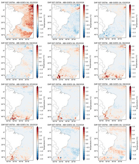 A comparison between SSTsat (ABI/GOES-16) and the analysis SSTfnd (OSTIA global product) was made within the study region (Figure 1) for the year of 2018, using the resampled daily average interpolated to match the same grid size (0.054°) of both products. The daily average SSTsat was obtained using only nighttime data and daytime with wind speed greater than or equal to 6 m.s−1 (for all pixels with QL between 3–5) to exclude diurnal heating influence. The wind speed was provided along with the ABI-GOES-16 product, obtained from a NWF [16]. For the spatial resampling, Bilinear Interpolation was used with the OSTIA product as reference. The results are expressed in terms of monthly average maps of the difference between SSTfnd (OSTIA)–SSTsat (ABI).