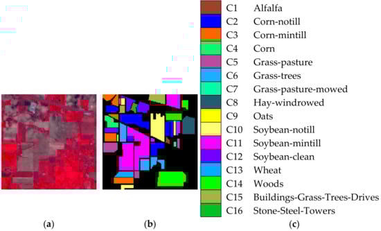 Indian Pines image was the first and famous testing data for hyperspectral image classification, which was obtained by AVIRIS sensors in 1992. The image of Indian Pines includes pixels and 220 spectral bands covering the range of 0.4 to 2.5 μm, which shows a mixed agricultural/forest area in northwestern Indiana, America. There are 16 inclusive classes in the available ground-truth map such as alfalfa, corn-mintill, soybean-nottill, etc., which are remarked as C1–C16. Figure 1a–c shows the false color image, ground-truth image, and reference map, respectively.