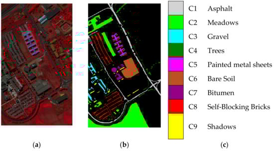 In 2003, the ROSIS sensor collected the Pavia University scene. The scene of Pavia University includes pixels and consists of 103 spectral bands with the wavelength varying with 0.43 to 0.86 μm. There are nine available inclusive classes in the ground-truth map including asphalt, meadows, gravel, etc. The classes in this scene are remarked as C1–C9 in the experimental results. Figure 2a–c shows the false color scene, ground-truth image, and reference map of the Pavia University scene, respectively.