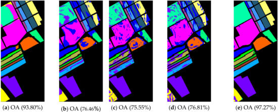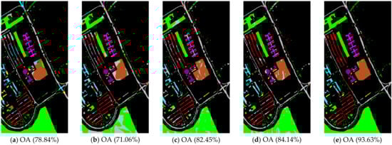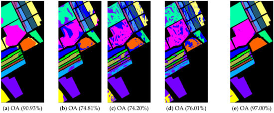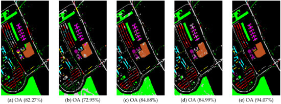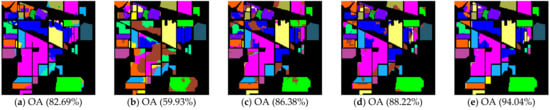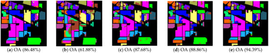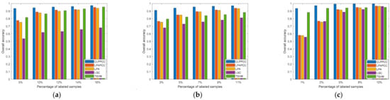 Several experiments with different size of labeled samples were performed in this section. To reduce randomness, we picked the average results of 10 runs repeatedly as the final record result for each hyperspectral dataset. Figure 7 shows the overall classification accuracy of our proposal and four alternatives in different sizes of labeled samples. The labeled samples percentage was 5%, 10%, 12%, 14%, and 16% for the Indian Pines dataset. For the Pavia University scene, the percentage of labeled samples was set to 3%, 5%, 7%, 9%, and 11%. The labeled samples percentage for the Salinas image was set to 1%, 2%, 5%, 8%, and 10%.