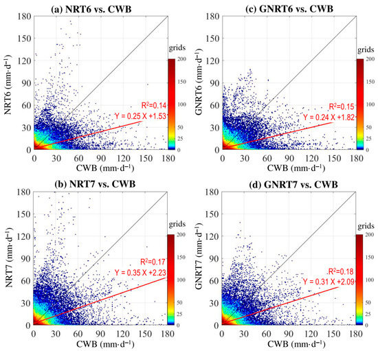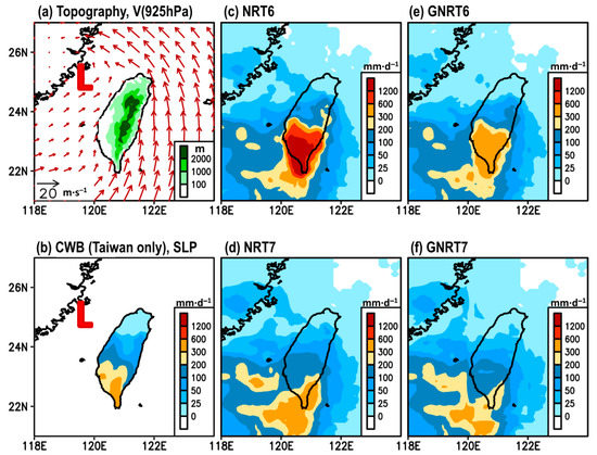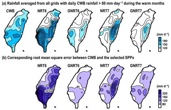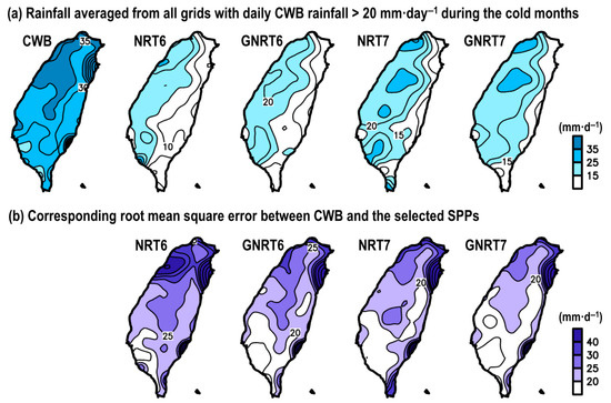 - Among the four SPPs, GNRT6 and GNRT7 were the best in capturing the daily rainfall variations, including stronger rainfall events during warm (Figure 4 and Figure 5) and cold months (Figure 6 and Figure 7), respectively. Spatially, the major improvements from NRT6 to GNRT6 and NRT7 to GNRT7 in monitoring the stronger rainfall events over southwestern Taiwan can be seen during warm and cold months, respectively. Between NRT6 and NRT7, NRT7 was better at monitoring larger daily rainfall over southwestern Taiwan during both warm and cold months.