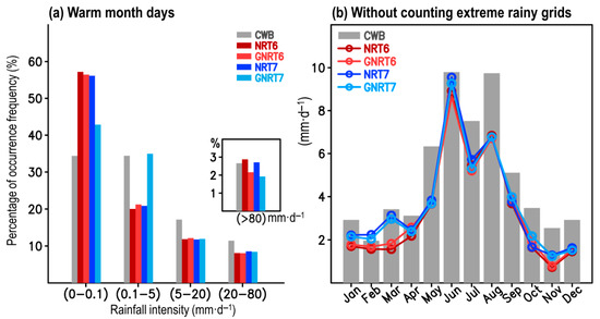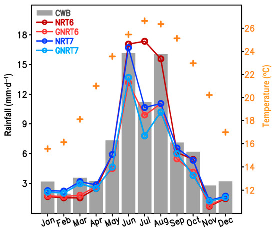 - For the annual cycle of monthly rainfall, NRT7 is superior in quantitative rainfall estimation (Figure 2). Among SPPs, most of them underestimated the monthly rainfall throughout the year (except NRT6, which overestimated July rainfall), and the observed errors were larger in the GNRTs than the NRTs. The differences between NRT and GNRT in depicting monthly rainfall are larger during warm months than during cold months. For monthly rainfall during the cold months, v7 performed better than v6, although this was not always true for the warm months. The differences between SPPs in depicting the monthly rainfall variations are mainly controlled by the stronger rainfall events (Figure 3).