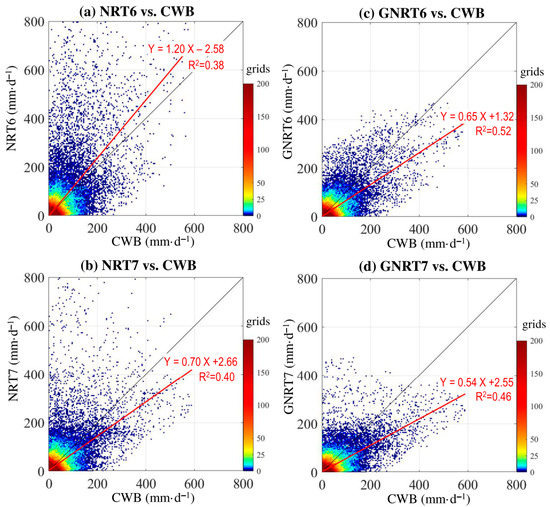 - GNRT helped reduce the error seen in NRT’s overestimation of stronger rainfall events for both warm and cold months in v6 and v7 (Figure 9 and Figure 10). NRT7 is better than NRT6 in both the warm and cold months. Possible explanations for the differences between the ability of SPPs are attributed to the algorithms used in SPPs.