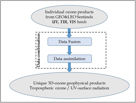 Figure 1. Two-stages approach used to combine the individual ozone products derived from UV, TIR and VIS bands, provided by both GEO and LEO Sentinels.