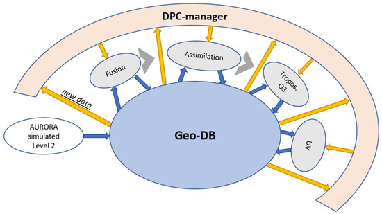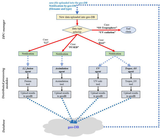 Figure 4. Logic flow of the distributed data processing. Yellow arrows indicate notification messages from geo-DB to DPC-manager and from DPC-manager to the processing modules; blue arrows indicate the data flow (input data downloaded from geo-DB and output data uploaded to geo-DB after processing).